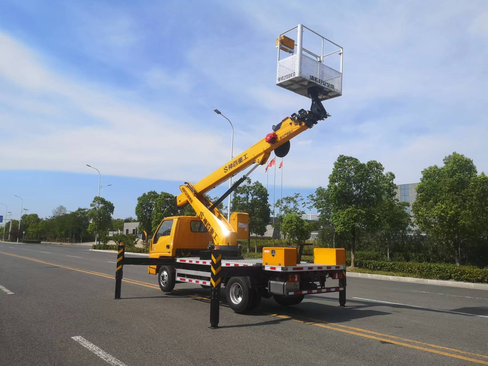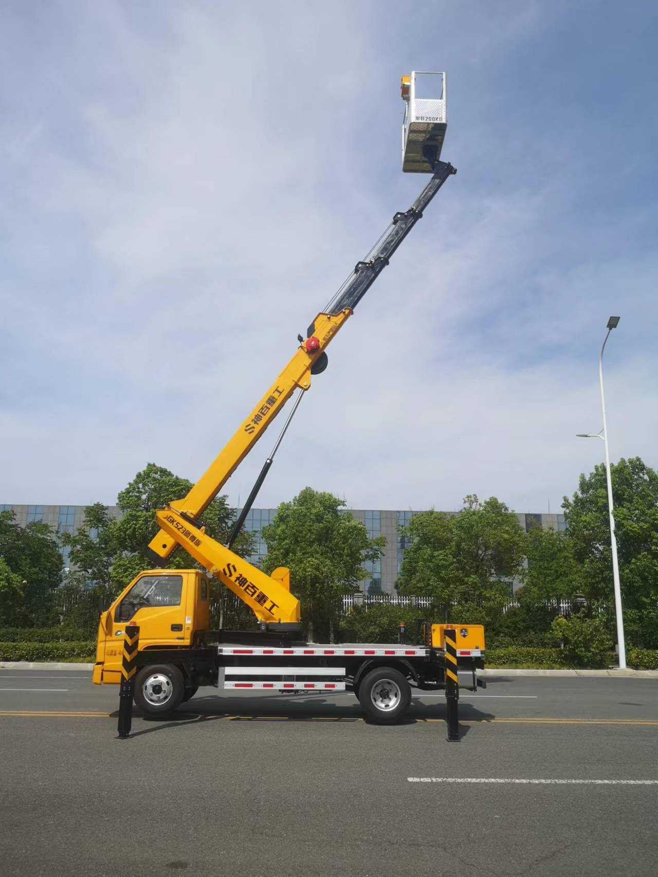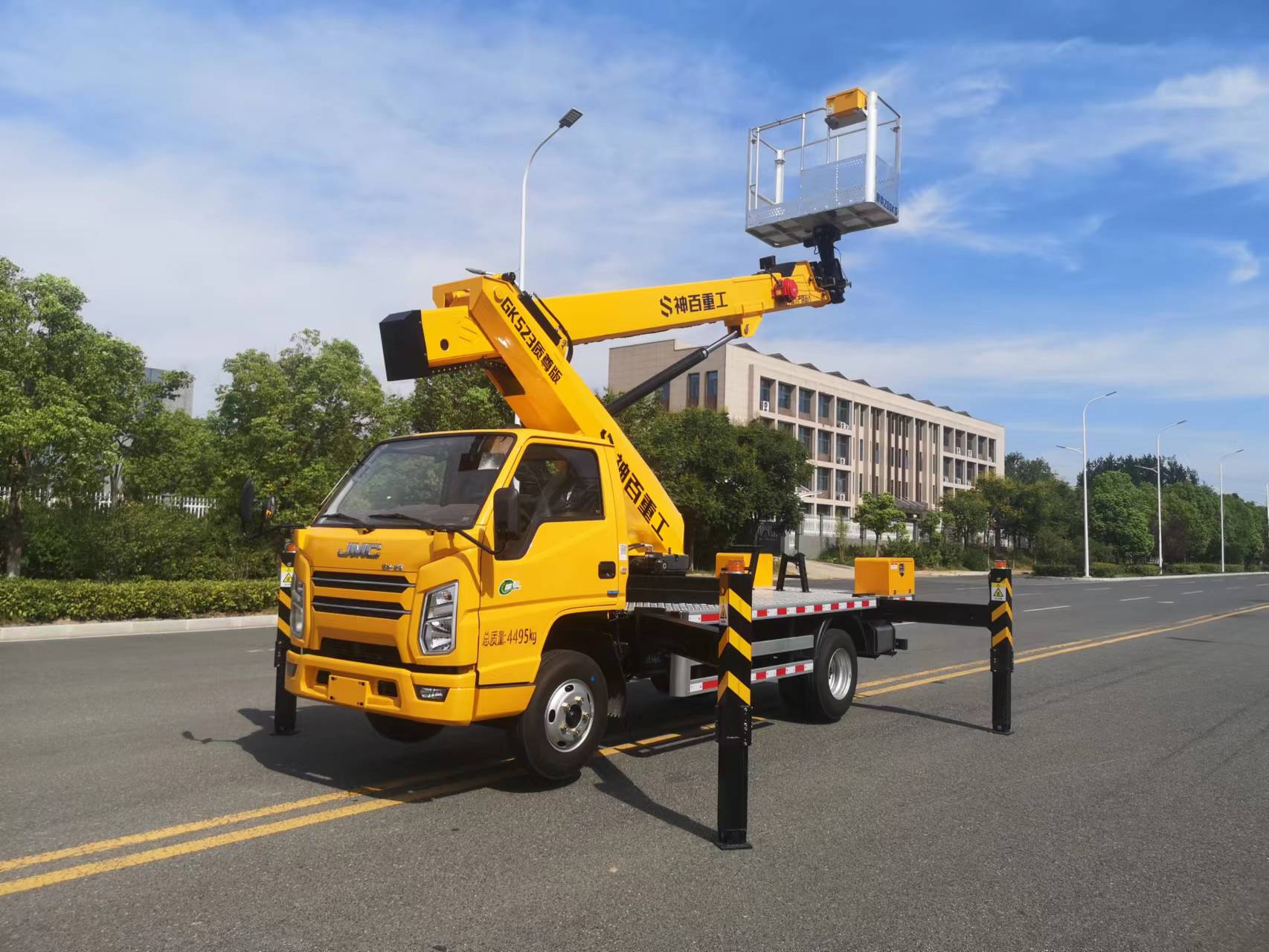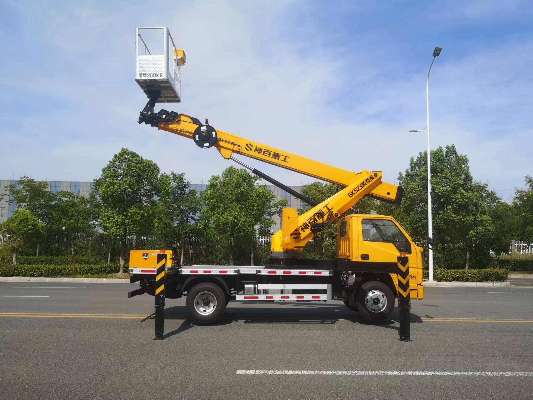 神百重工GKS23质尊版高空车! 江铃蓝牌23米高空作业车,蓝牌C证驾驶,市区畅行无阻,整车优质选材,精工制造, 吊蓝360°旋转,4节六边形大臂同步伸缩,前V后H方形支腿,稳定更承载,作业车可以载重200公斤,标配的无限遥控操作,最大作业高度23米,上牌免购置税,全国都可以上牌。