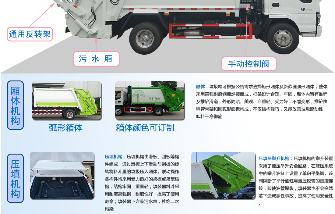 | 配置介绍 | (1)箱体采用国标4mm厚Q345材质锰钢板制作,圆弧形箱体,无筋条,美观大方且强度高。底箱及填充器采用加厚钢板,边四底五板材。 (2)箱体容积3.5方,双向压缩。 (3)在填塞器翻转填料斗和装填器间加装一个边缘挡板以防止垃圾外泄,(4)加强装填器与车厢连接处的密封,以防止压缩过程中垃圾外泄和垃圾渗滤液的滴漏。 (5)后装进桶机构,可与120L/240L/660L标准塑料桶对接作业,翻桶机构采用轻量化设计,举升进料动力强劲,操作系统采用德国西门子PLC一键控制系统,手电一体操作模式,尾部左右双边控制盒,带驾驶室操作。 (6)尾部填装机构有5种样式:摆臂式翻转架、挂桶式翻转机构、大落地斗、小三角斗、无翻转机构。 (7)液压系统选用扬州中梅多路阀,合肥长源油泵,全车海普瑞斯(合资品牌)液压油缸,日本华尔卡密封圈。 | ||