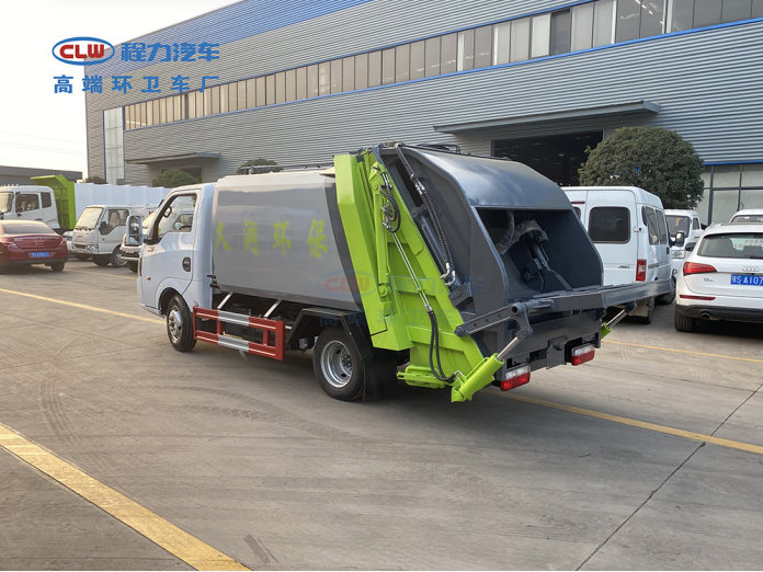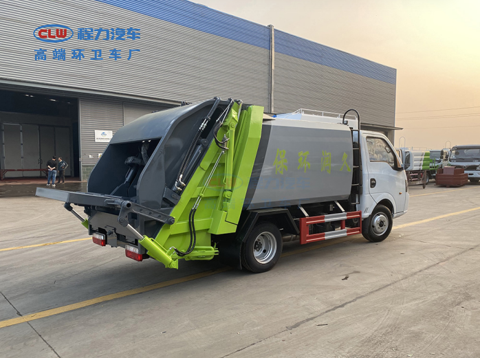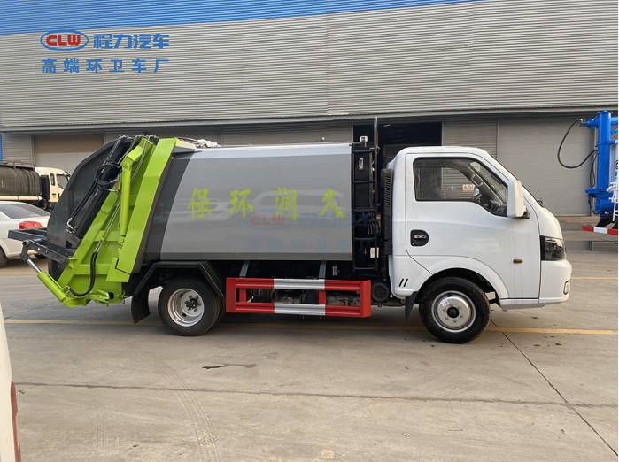上装配置:箱体采用高强度钢板制作,边2mm底3mm,容积3.5立方,双向蠕动压缩功能,采用知名品牌博利油缸、高密度高压油管、中梅多路阀、合肥油泵,手电液操作,驾驶室内外控制,带PLC一键循环操作系统、尾部带污水箱、后挂双桶翻转机构。