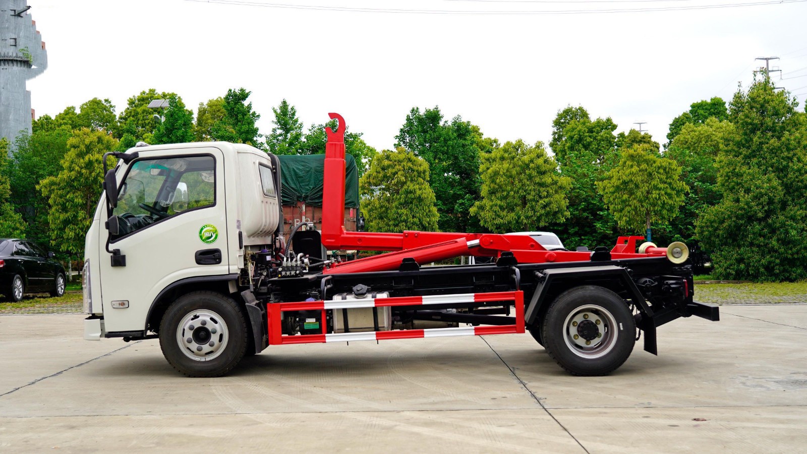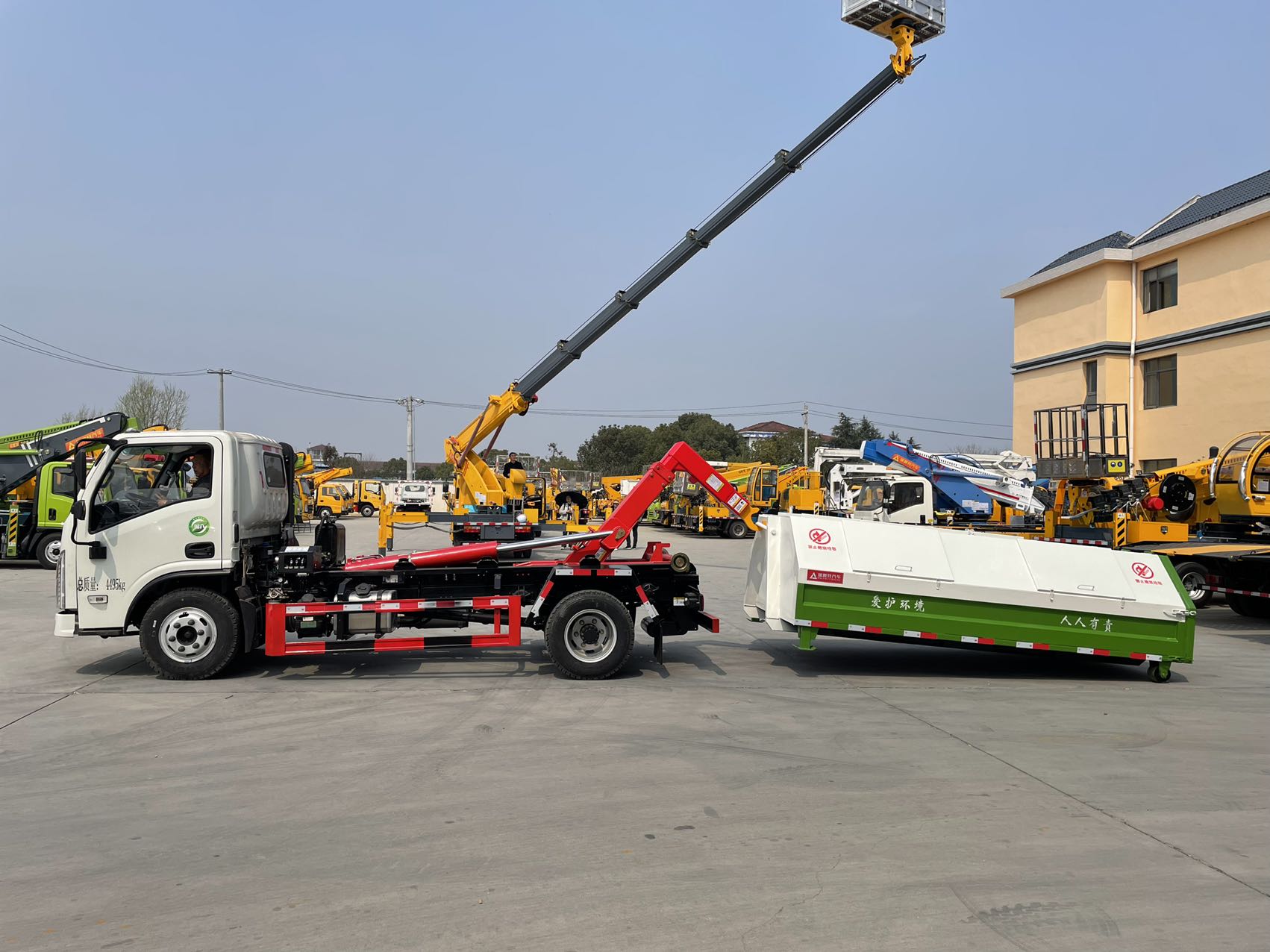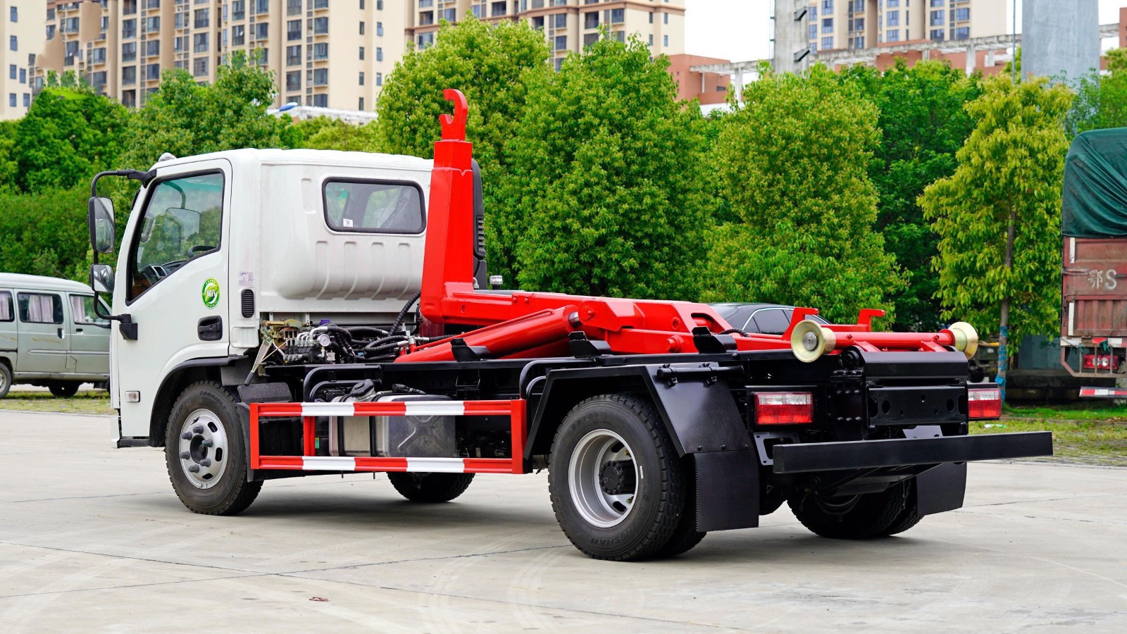6.拉臂上装:拉臂上装均经抛光除锈处理,多道工序上漆,确保外观及色泽符合要求;拉臂上装总成均经过专用台架试验及重负荷负载试验,确保品质。强度合金钢一体式主勾臂,加强型副梁,铸钢尾托轮,手电一体液压操控装置,上装最大提升能力6000KG, 液压完成上箱+下箱+锁紧+自卸等作业,实现一车配多箱的循环转运。